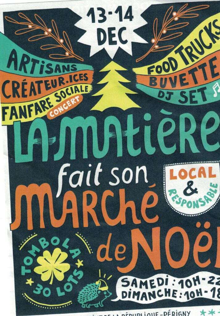 La Rochelle Perigny. Quatrième édition du Marché de Noël local et responsable de La Matière, structure pionnière de ces sujets, sur leur tiers-lieu de Périgny au 8 rond-point de la République.